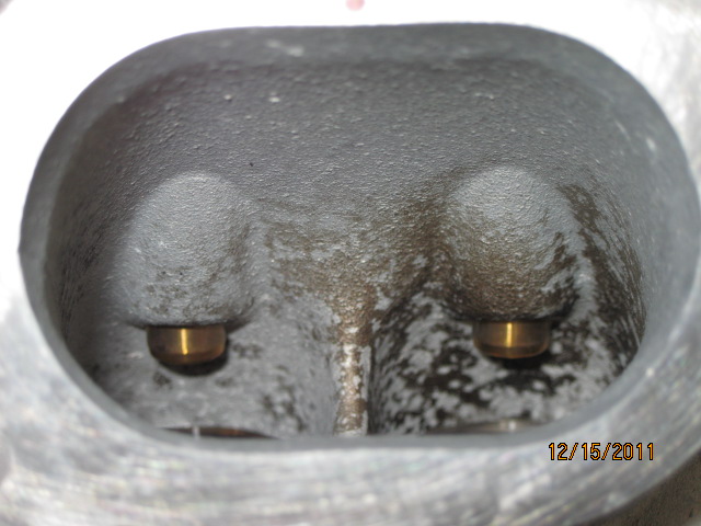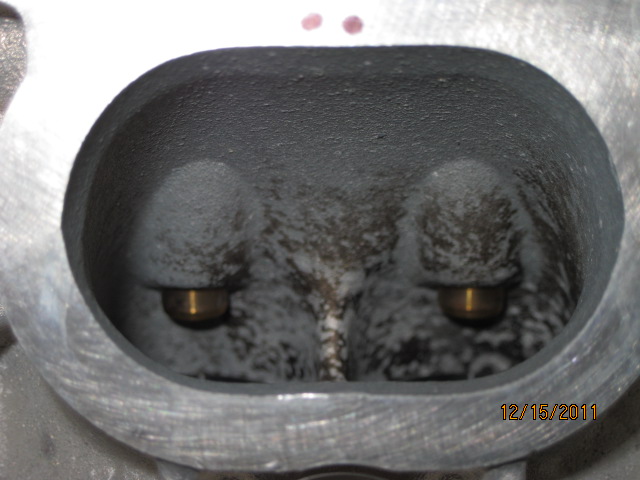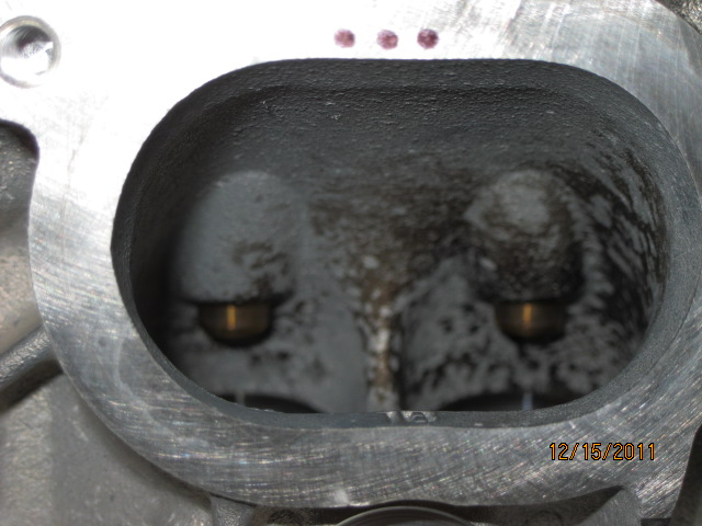 We know that a pretty steady flow of oil was getting into the chambers, evident by the very heavy build-up of carbon. After first laying eyes on the heads I expected the intake guides to be worn (And yes, the guide wear from valve to valve was very consistent). Carbon build-up in the chambers, ports and the backs of the valves was heavy. Check out the photo below.